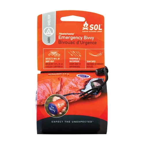 Vakum-materialisert polyethylene bivvy pose. Reflekterer tilbake opptil 90% av utstrålt kroppsvarme. Nylonsekk med snor. Veier kun 108 gram
