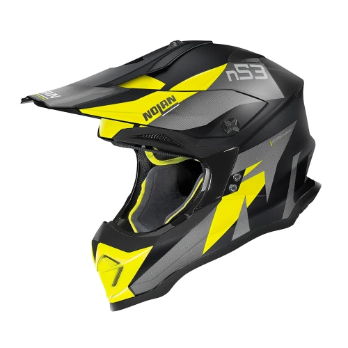 N53 er en crosshjelm fra Nolan. Kult design og utpreget personlighet, i tråd med de nyeste trendene i sin klasse. Hjelmen er laget av polykarbonat og har en pustende liner og indre padding som enkelt kan fjernes før vask. Med det effektive ventilasjonssystemet gir det et helt supert klima i hjelmen